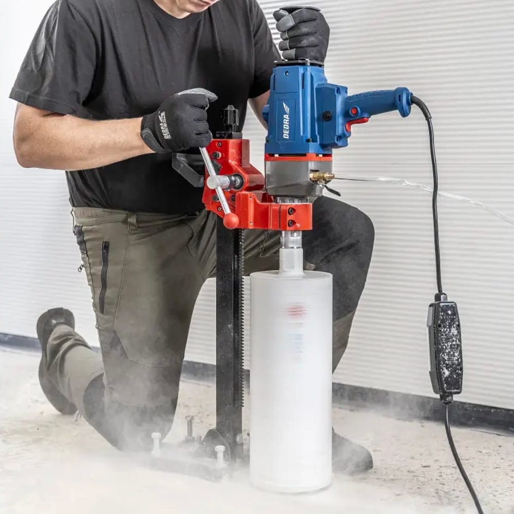 Dijamantne krune svrdla omogućuju učinkovito bušenje u izuzetno tvrdim materijalima, što bušilicu čini neprocjenjivim alatom kako u građevinskim tako iu renovacijskim radovima. Uređaj je dizajniran za rad s vodom, koja djeluje kao rashladno sredstvo i smanjuje stvaranje prašine, što poboljšava uvjete rada, posebno u zatvorenim prostorima.